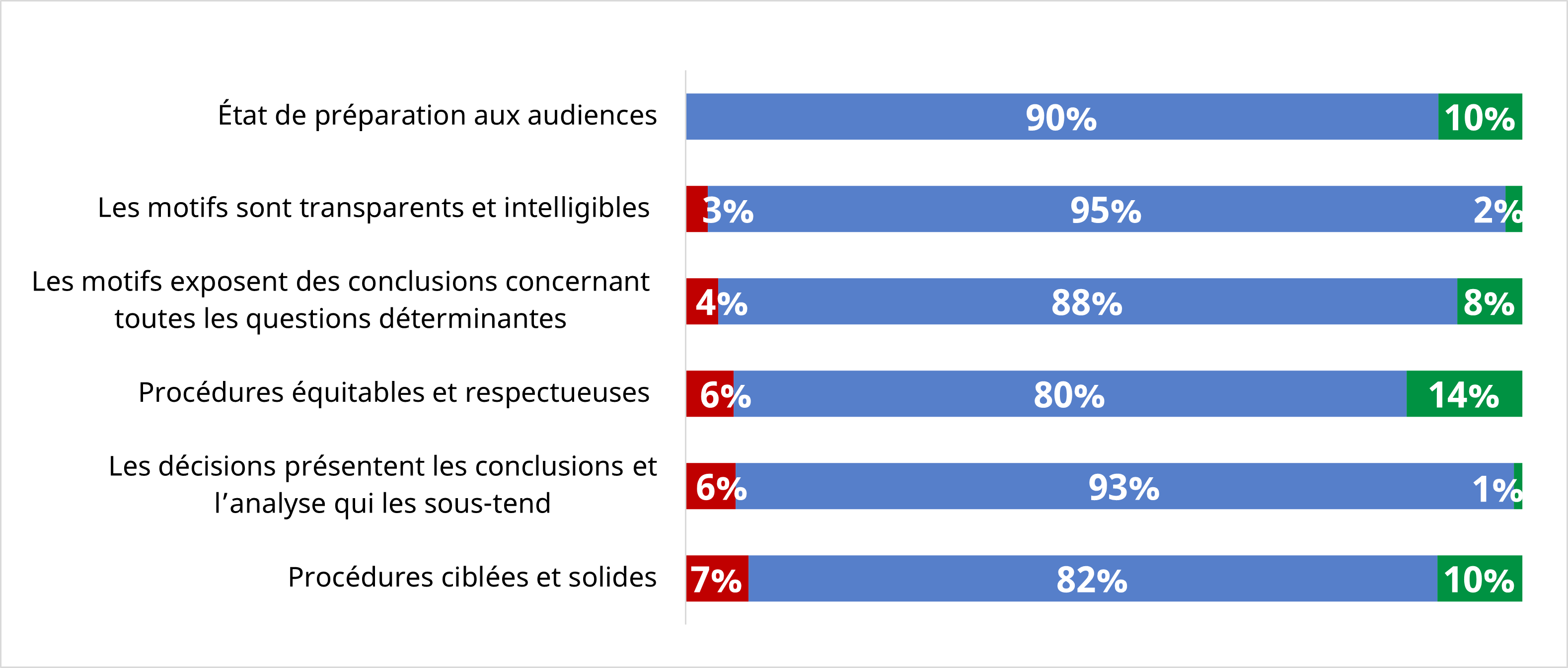 | Procédures équitables et respectueuses | 6 % ne répond pas aux attentes | 80 % répond aux attentes | 14 % dépasse les attentes |